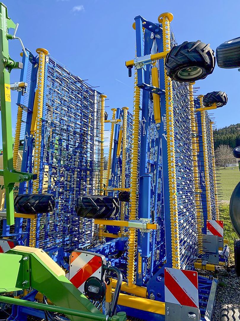 - 6 roues pendulaires 18 x 8.5 6 PR, réglables en hauteur à l’arrière de la herse