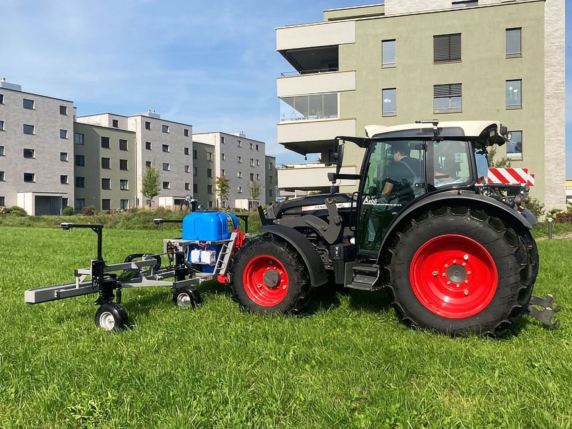 Les exigences imposées au tracteur sont très faibles, car la machine dispose d’un groupe hydraulique intégré et d’un alternateur avec batterie. Un système hydraulique avant avec prise de force avant suffit pour utiliser cette machine.